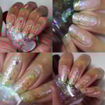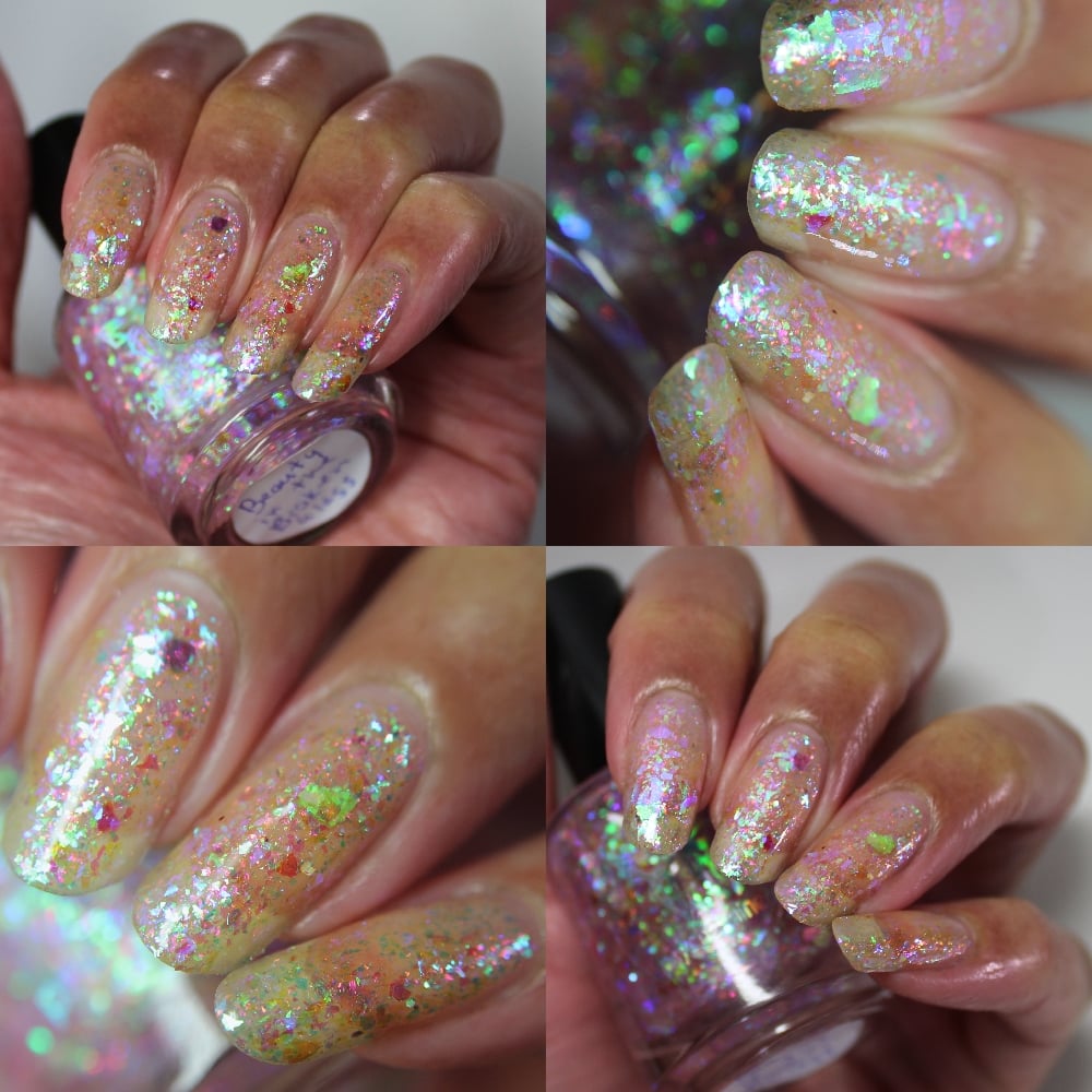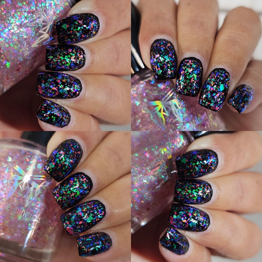 Beauty in the Broken Glass - a beautiful topper loaded with violet/blue, red/orange, and green/aqua iridescent flakes.