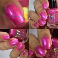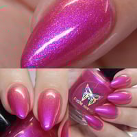 Queen of bleeding hearts is a magenta based polish with red to orange aurora shimmer and a little purple/pink shimmer mixed in. Inspired by the variety of color the Bleeding Hearts flower come in.